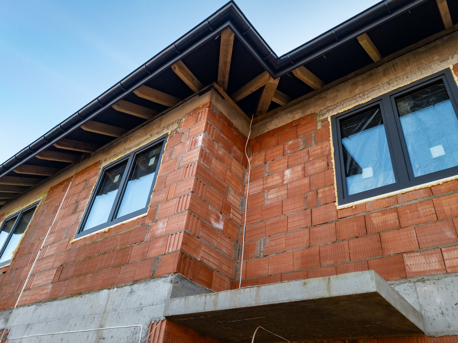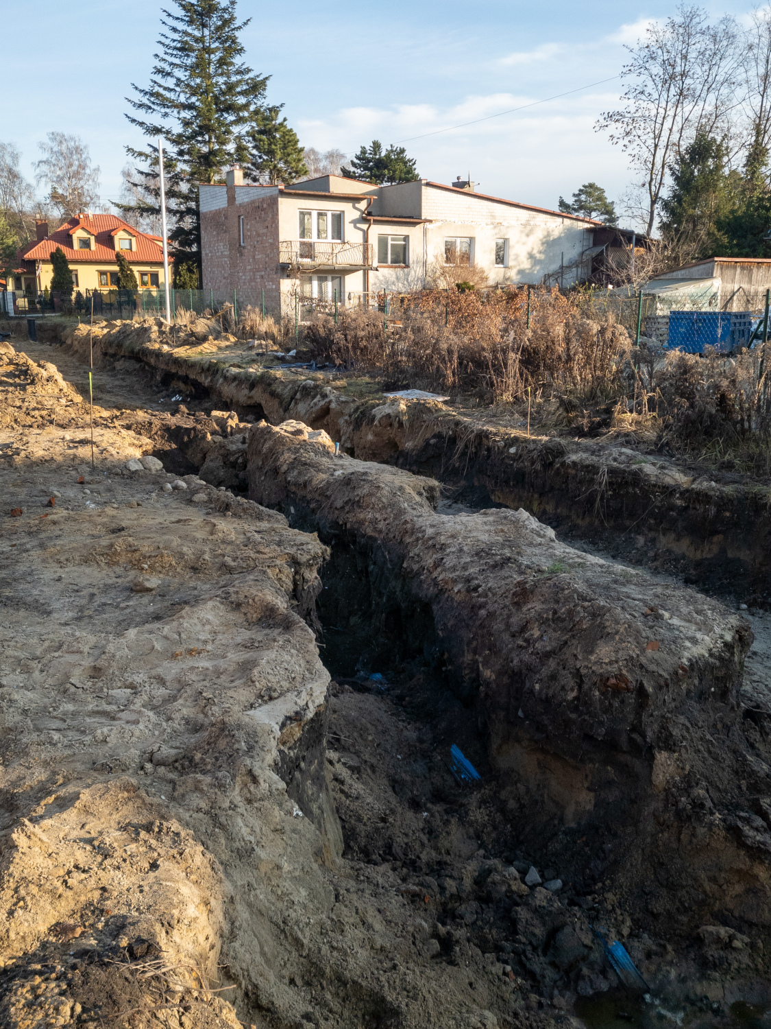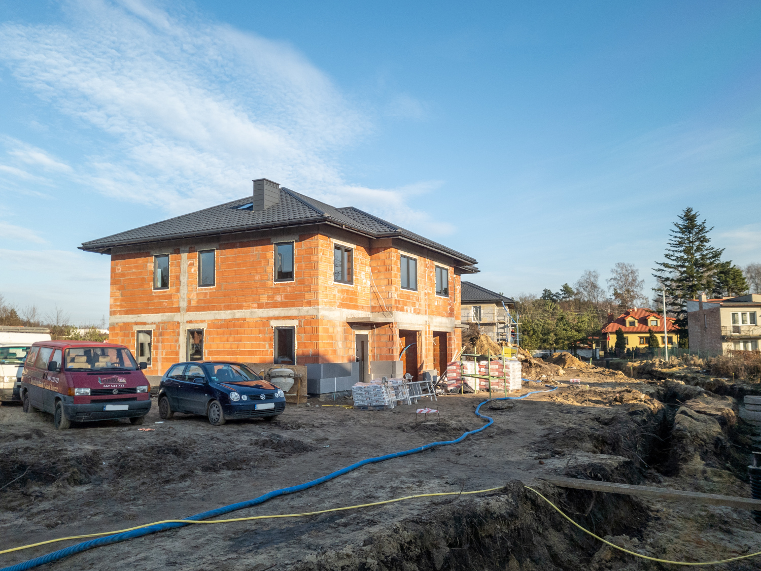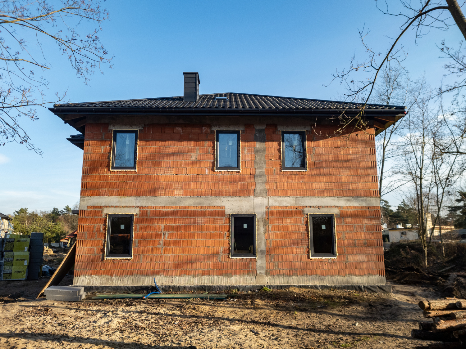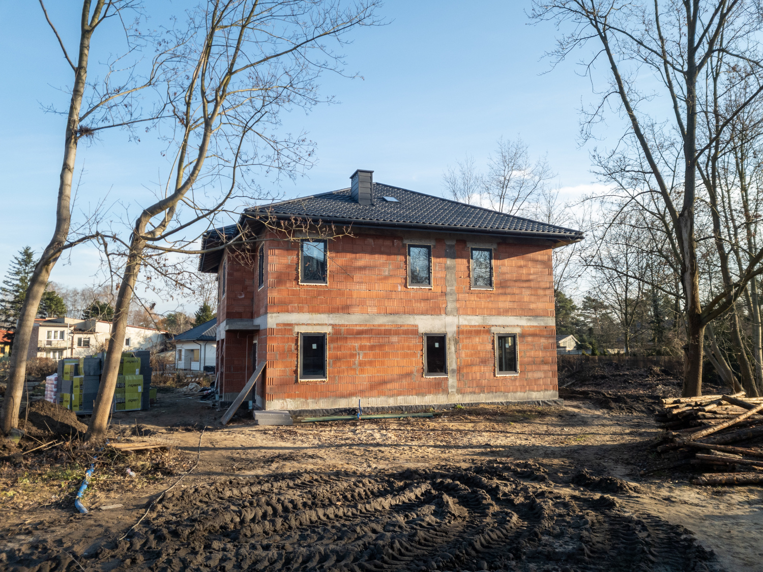 Budynki oznaczone literami L, K, F oraz E znajdują się obecnie w stanie surowym z zamontowaną stolarką okienną i wykonanymi dachami. Część z nich jest już na etapie prac związanych z ociepleniem, co stanowi ważny krok w kierunku dalszych robót elewacyjnych. Równolegle prowadzone są intensywne prace wewnętrzne, przygotowujące domy do kolejnych etapów wykończenia.