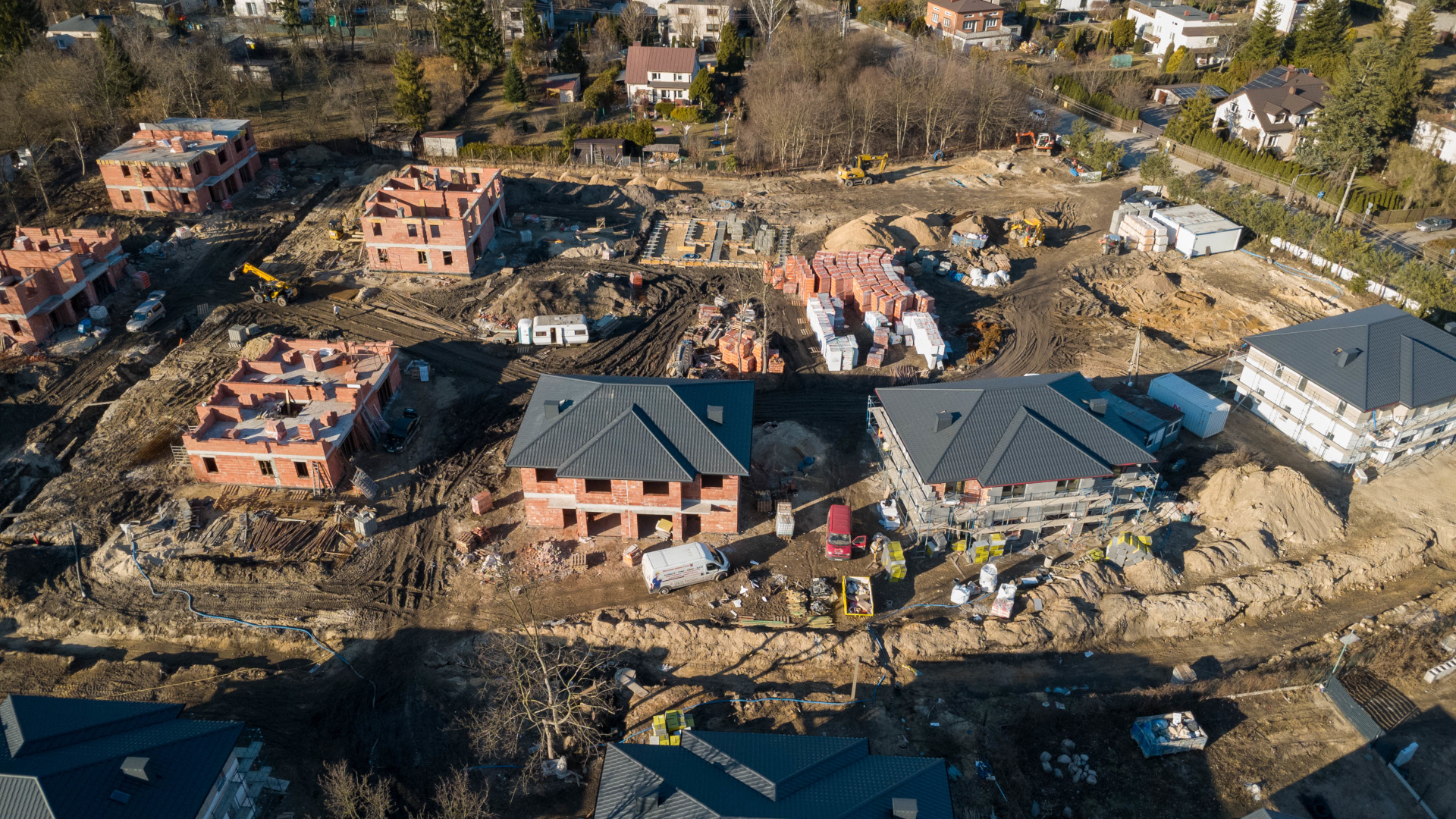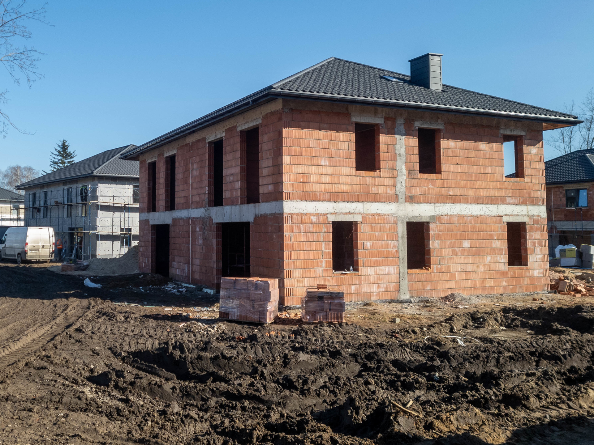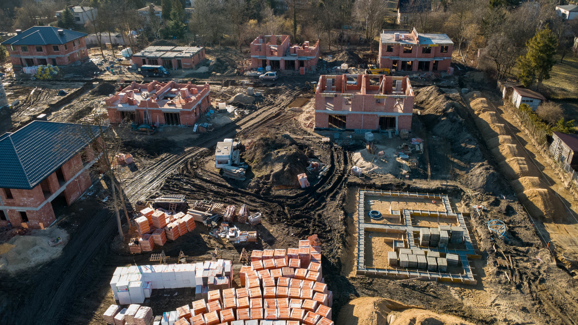 Budowa osiedla Sportowa Park w Kolumnie systematycznie posuwa się do przodu. Większość domów jest już na różnych etapach realizacji, od budynków w stanie zamkniętym, przez domy z wzniesionymi ścianami, aż po obiekty w początkowych fazach budowy.